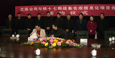 集團屬下子公司重慶文(wén)迅網絡科技有(yǒu)限公司與中國鐵(tiě)路(lù)十七局戰備倉庫在經過長達2年的(de)磋商後,于2006年11月(yuè)30日,正式完成戰備倉庫信息化合作項目的(de)簽約。此次合作項目涉及到(dào)數字倉庫、人(rén)事管理(lǐ)、财務系統、進銷存系統以及局網系統搭建等企業(yè)信息管理(lǐ)系統,該系統成功實施後,中國鐵(tiě)路(lù)十七局戰備倉庫的(de)吞吐量将提高(gāo)兩倍以上(shàng),貨物(wù)出入庫時間将大(dà)大(dà)高(gāo)于同行(xíng)業(yè)标準,成爲西(xī)南地(dì)區金(jīn)屬材料倉儲的(de)重要基地(dì)。